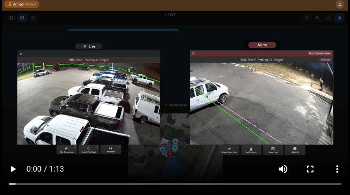 For starters, CHeKT’s active deterrent measures of automated audible announcements, lighting, and sirens in real-time of suspicious activity provide an immediate first line of security defense. Real-time alerting to the command center with live monitoring capabilities means 24-hour operators can initiate live audible warnings and immediately dispatch security before a break-in occurs. With live video monitoring and visual situational awareness, you can catch criminals in the act, increasing the chances of apprehending them and preventing future crime.