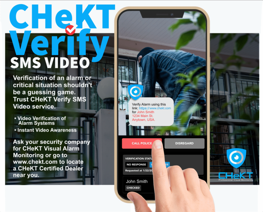 CHeKT has created a turnkey method of turning a reactive video surveillance system into a proactive visual security solution. With the CHEKT Video Control Panel, your AI-based cameras become instant alarm detection zones with notifications to a simple-to-use customer mobile app and alarm signals to 24/7 video command centers.